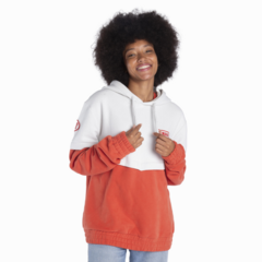 Sudadera unisex retro en naranja quemado y blanco, con capucha, logotipos rojos de Yamaha y Sports Heritage. Cómoda y llamativa.